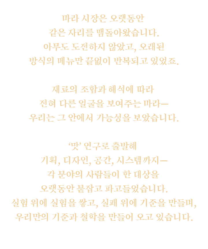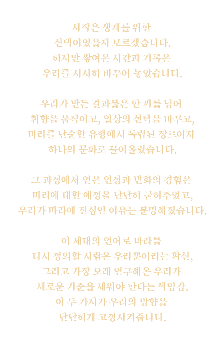 이 세대의 언어로 마라를 다시 정의할 사람은 우리뿐이라는 확신, 그리고 가장 오래 연구해온 우리가 새로운 기준을 세워야 한다는 책임감. 이 두 가지가 우리의 방향을 단단하게 고정시켜줍니다.