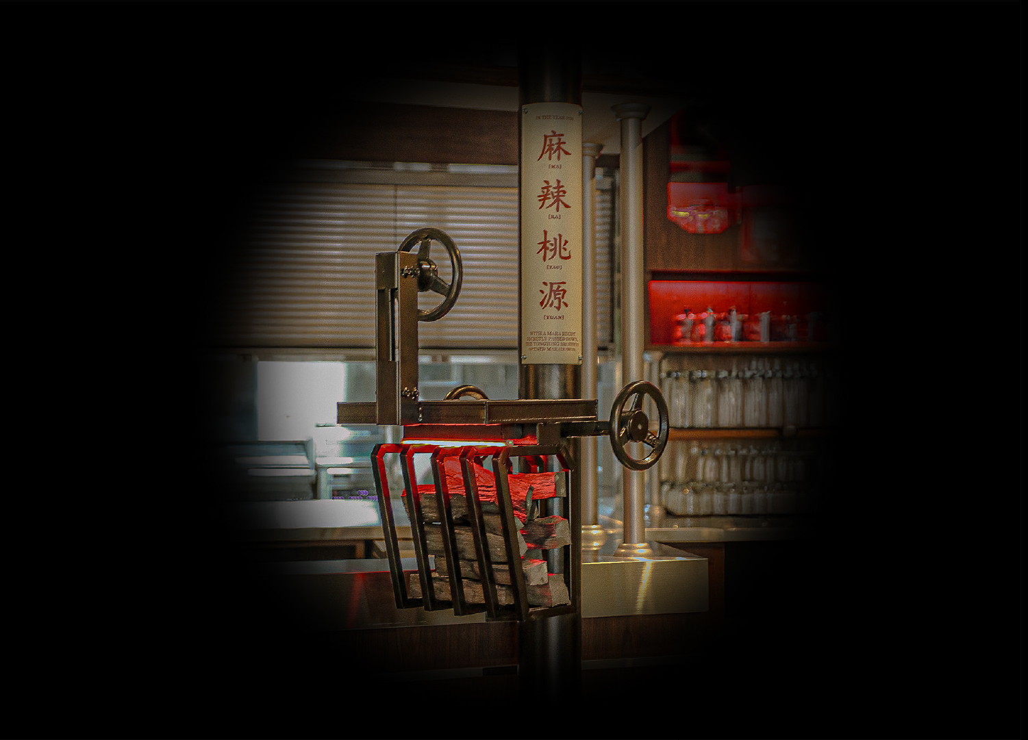 3) 기둥 직화그릴 기둥에는 빨간조명속 그을린 목재들로 오랫동안 끓여낸 장인의 육수를 연상시키는 장식 요소를 더해, 브랜드의 정체성을 시각적으로 강조합니다. 공간의 조형과 브랜드 정체성을 유기적으로 연결하여, 브랜드만의 독창적인 식경험을 암시합니다.