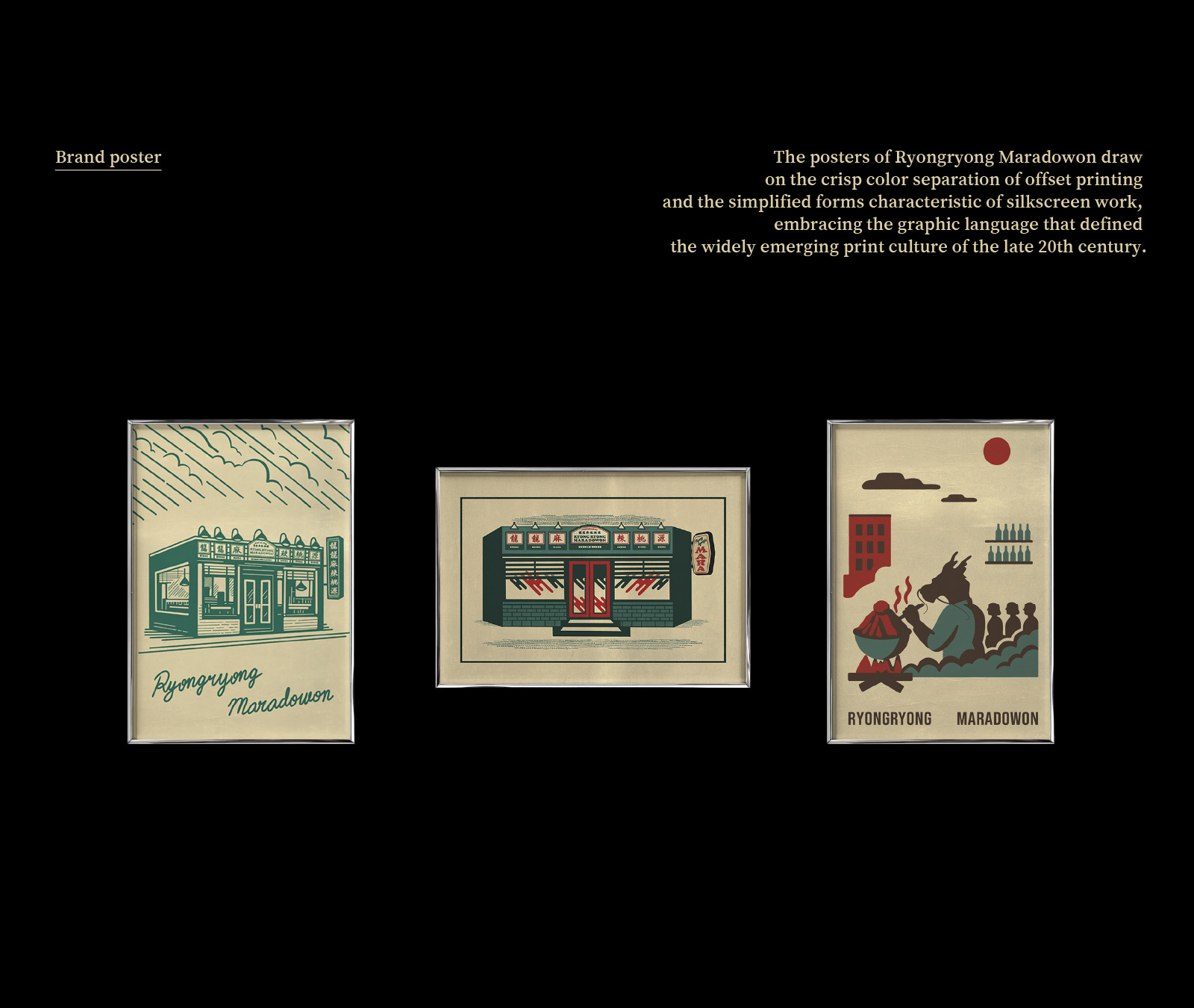 4) 포스터 룡룡마라도원의 포스터는 20세기 후반 인쇄 문화가 폭넓게 자리 잡던 시기의 그래픽 언어 를 기반으로 제작되었습니다. 오프셋 인쇄 특유의 선명한 색 분리와 실크스크린 방식에서 비롯된 단순한 형태미를 차용해, 브랜드의 젊고 경쾌한 에너지를 직관적인 시각 언어로 풀어냈습니다.