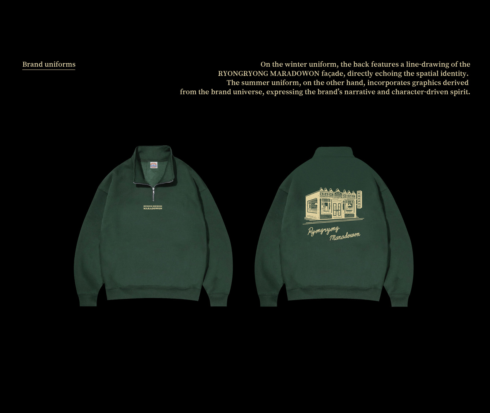 5) 유니폼 두 유니폼 모두 전면에는 군더더기 없이 로고 타입만을 담아 절제된 인상을 유지했습니다. 겨울 유니폼의 후면에는 마라도원 파사드를 섬세한 라인 드로잉으로 담아내 공간 아이덴티티와 맞닿게 했고, 여름 유니폼의 후면에는 용용이 세계관에서 파생된 그래픽을 적용해 브랜드의 서사와 캐릭터성을 경쾌하게 드러냈습니다. 각각의 유니폼은 서로 다른 표현 방식을 취하지만, 공간과 경험의 시각적 일관성을 강화하며 브랜드에 대한 몰입감을 한층 높여줍니다.